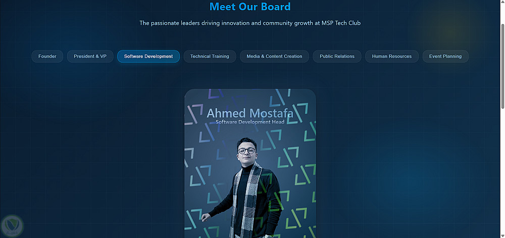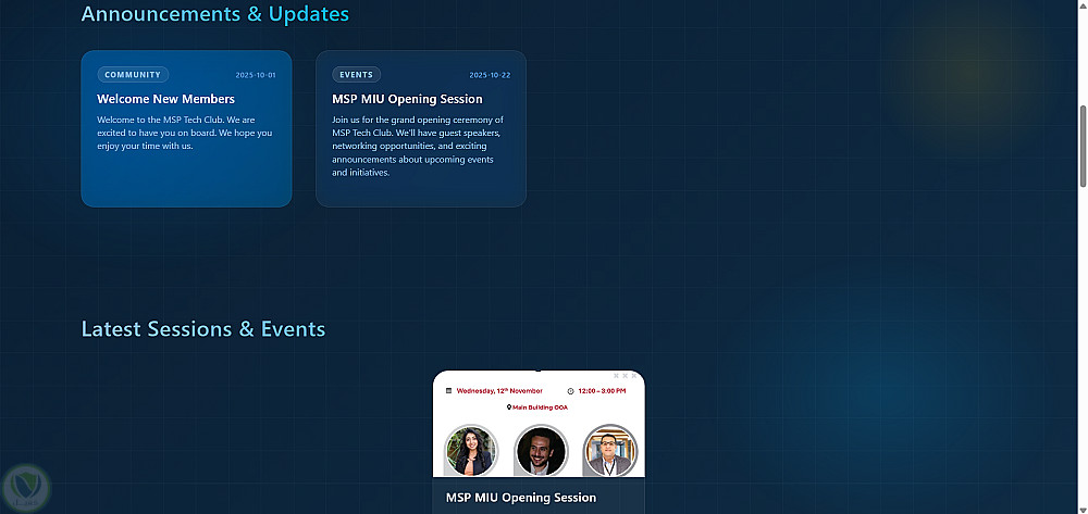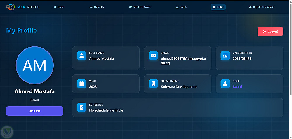 MSP-MIU Website هو نظام إدارة متكامل لأعضاء نادي MSP، الجلسات، الفعاليات، التمارين، ولوحات الصدارة، تم تطويره باستخدام React 18، Vite، Node.js، Express، MySQL، وSequelize مع JWT وbcrypt لضمان أمان الحسابات وكفاءة النظام. تشمل المنصة إدارة الأعضاء والمجلس، تسجيل الدخول وتفعيل الحسابات عبر البريد الإلكتروني، إدارة الفعاليات والجلسات، تتبع الحضور، التمارين، ولوحة الصدارة. تدعم الواجهة واجهة سلسة وحديثة باستخدام React، Framer Motion، React Router، وReact Icons، مع رفع الملفات عبر Multer وإرسال الإشعارات تلقائيًا عبر Nodemailer. تم اختبار المشروع وضمان الجودة، وتم نشره على Heroku مع قاعدة بيانات MySQL ودومين رسمي.