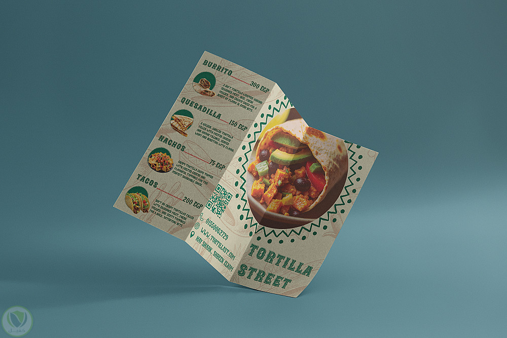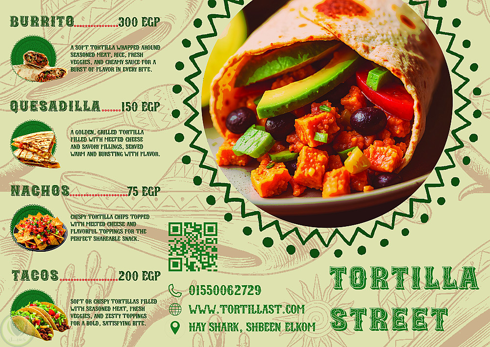 ده تصميم منيو لمطعم يقدم أكل مكسيكي، وكانت أول تجربة لي في تصميم قوائم طعام بشكل كامل.