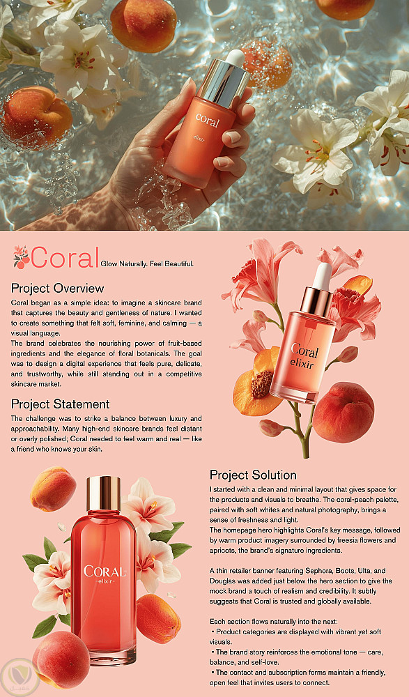 قمت بتصميم صفحة هبوط لعلامة Coral Skincare تُبرز جمال البساطة والعناية الطبيعية بالبشرة. اعتمدت في التصميم على ألوان هادئة وهوية بصرية نظيفة تعكس نقاء المنتجات وتركيزها على المكوّنات الآمنة. تتضمّن الصفحة عرضًا واضحًا للمنتجات، فوائدها، وآلية استخدامها، مع تجربة مستخدم سلسة تساعد الزائر على استكشاف العلامة واتخاذ قرار الشراء بسهولة. هذا المشروع يبيّن قدرتي على تقديم تصميمات عصرية متناسقة تخدم العلامات المتخصصة في الجمال والعناية بالبشرة