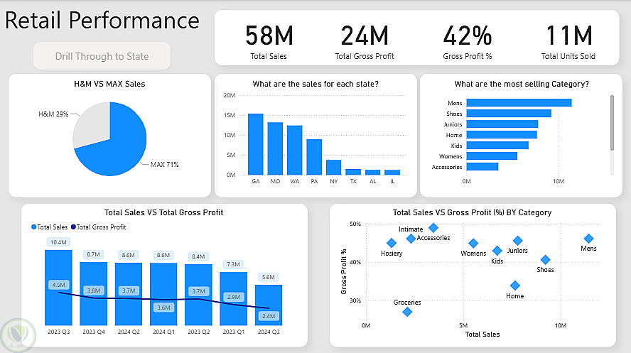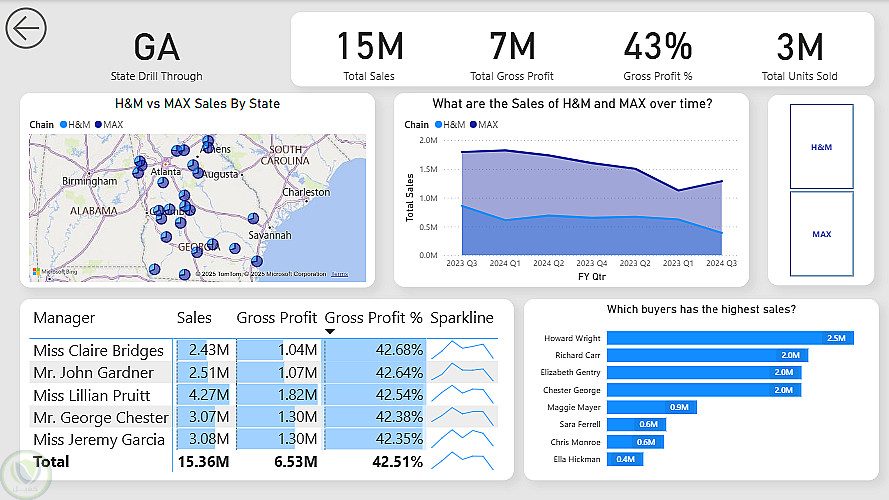 هذا الداشبورد يعرض رؤى واضحة عن المبيعات، الأرباح، وسلوك العملاء لسلسلتي H&M و MAX، مع إمكانية الانتقال التفصيلي (Drill-through) لعرض تفاصيل الأداء حسب الولاية أو المدير أو المشتري.