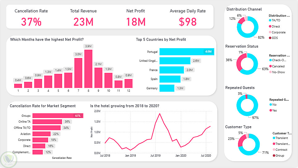 - حسابات DAX: تم تصميم مقاييس مالية وتشغيلية معقدة (مثل صافي الربح، ومعدل الإلغاء).