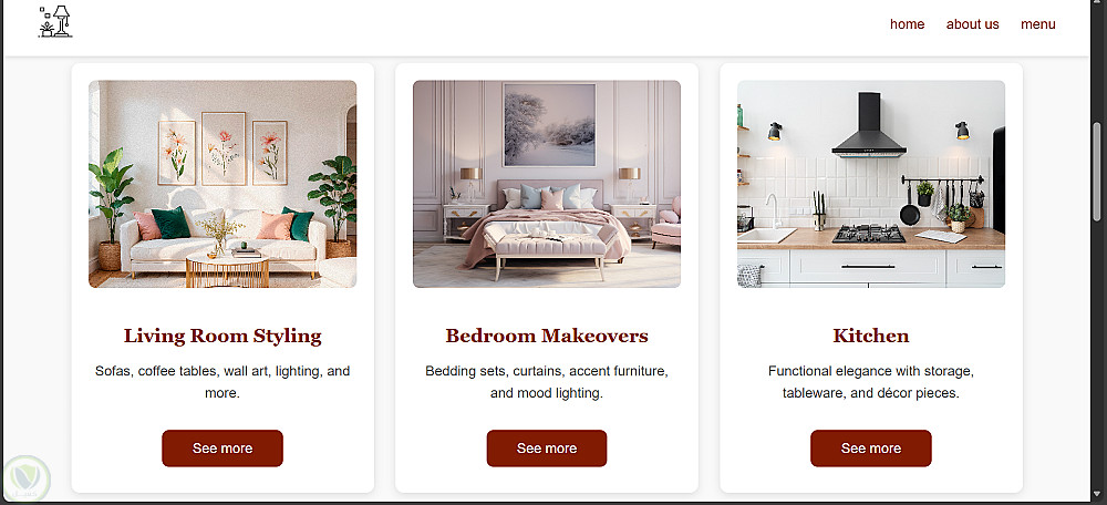هذا العمل عبارة عن صفحة ويب تفاعلية لمتجر ديكور داخلي تهدف إلى عرض خدمات التصميم والمنتجات بطريقة أنيقة وسهلة التصفح.