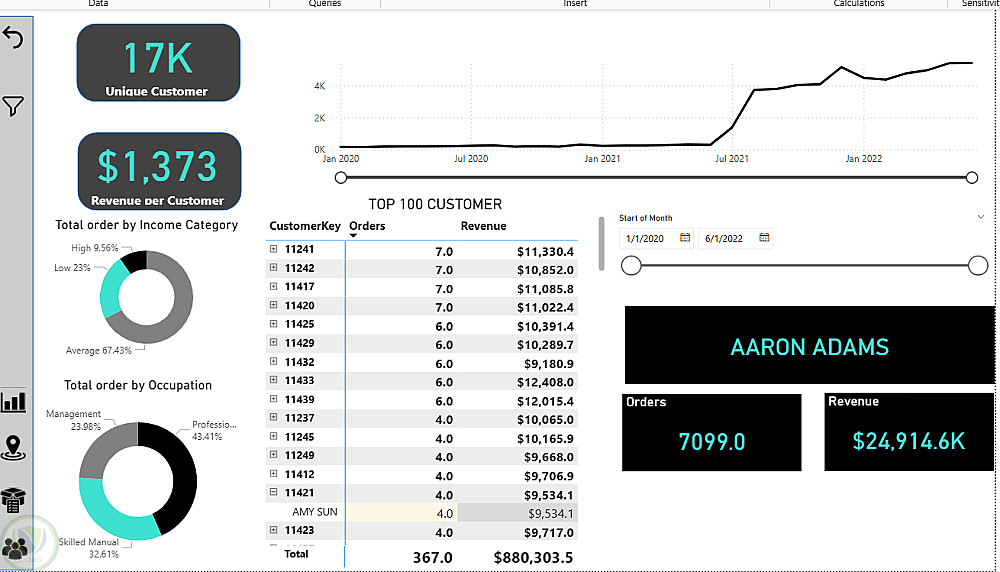 > * تحليل العملاء: تحديد العملاء الفريدين (17K)، حساب متوسط الإيراد لكل عميل ($1,373)، وعرض قائمة العملاء الأفضل (Top Customer).