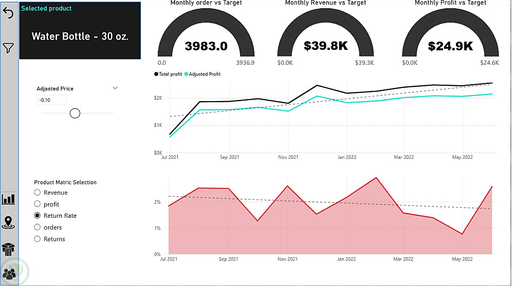 > * مؤشرات الأداء الرئيسية (KPIs): عرض فوري لـ إجمالي الإيرادات ($24.9M)، إجمالي الأرباح ($10.5M)، و معدل الإرجاع (2.2%).
