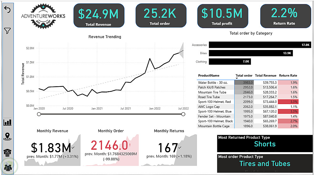 > * تحليل المبيعات: تتبع اتجاهات الإيرادات الشهرية والسنوية (Revenue Trending)، وتصنيف الطلبات حسب فئة المنتج (Bikes, Accessories).