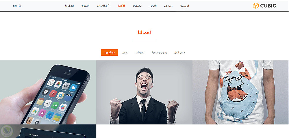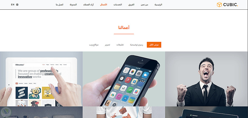 - فلترة ديناميكية فورية: دمج مكتبة Isotope.js في قسم "الأعمال"، مما يسمح بفرز وتصنيف المشاريع بلمسة واحدة وبانسيابية عالية دون الحاجة لإعادة تحميل الصفحة.