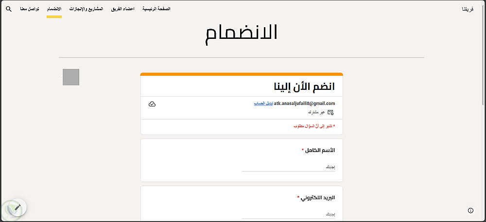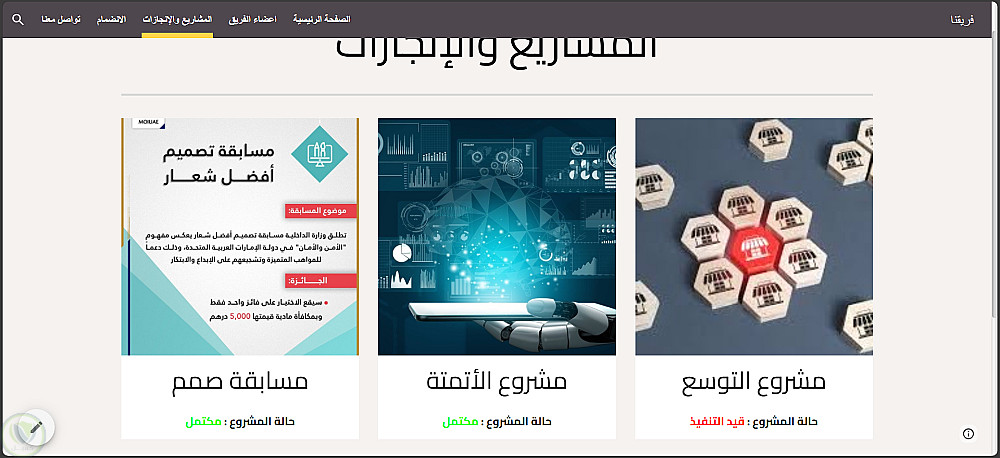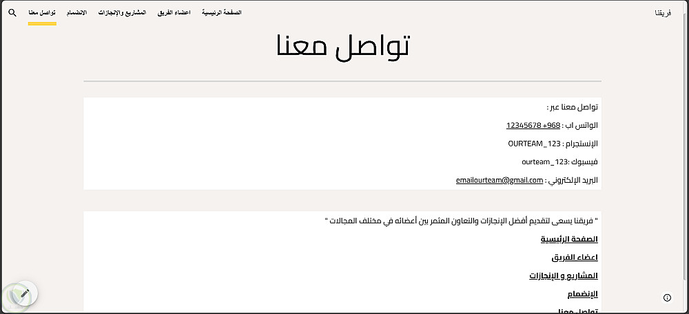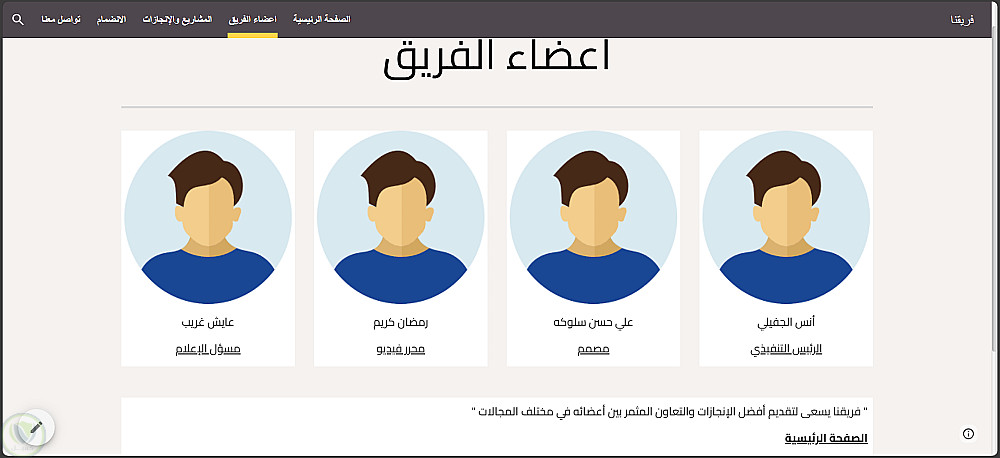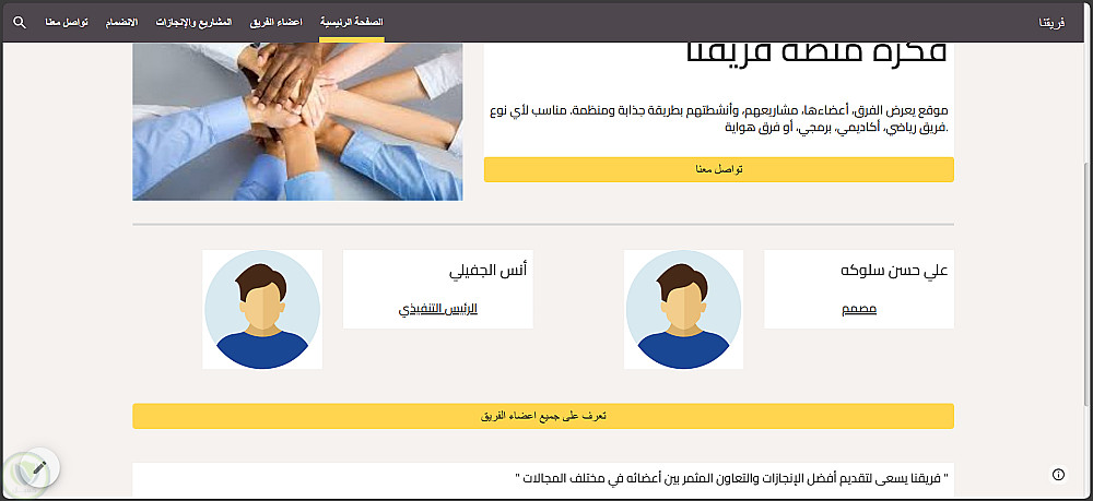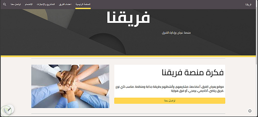 تصميم موقع نموذجي باللغة العربية لعرض فرق العمل وأعضاءها، مشاريعهم وأنشطتهم بطريقة منظمة وجذابة، مع إمكانية تسجيل أعضاء جدد والتواصل مع الفريق.