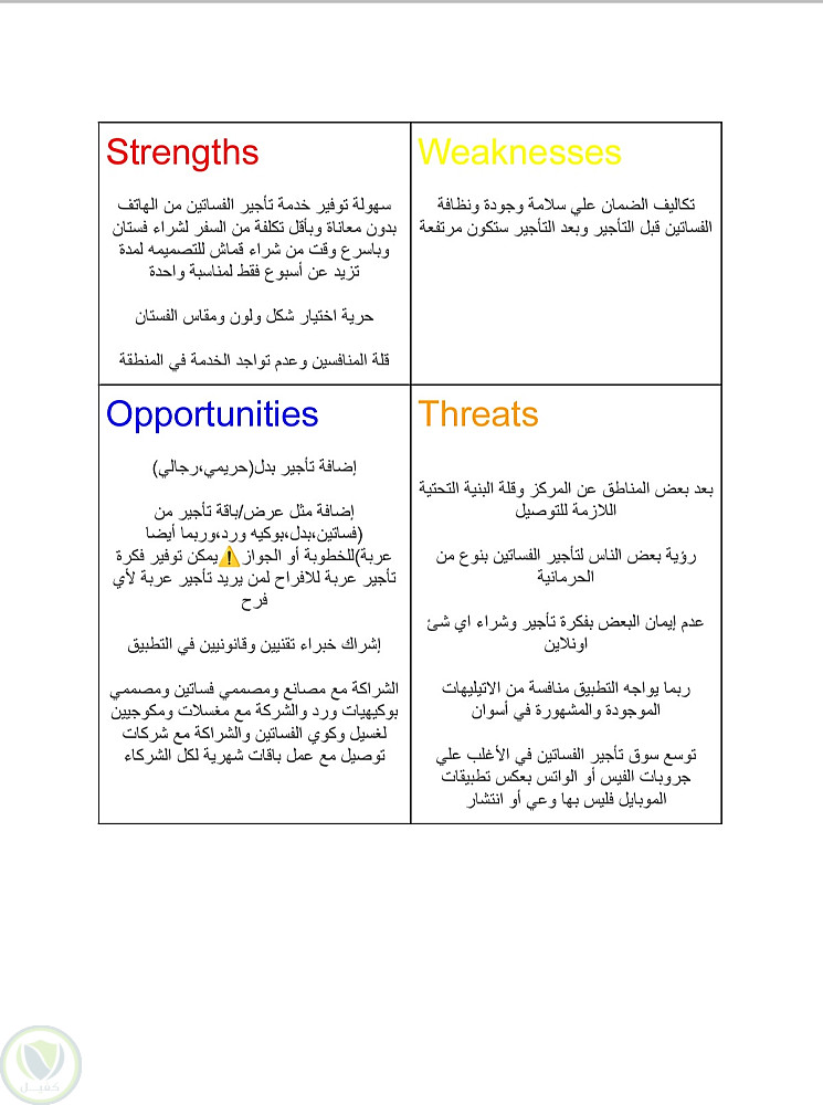 الملف عبارة عن تحليل SWOT شامل لتطبيق تأجير فساتين، تم العمل عليه ضمن نشاطاتي مع Enactus.