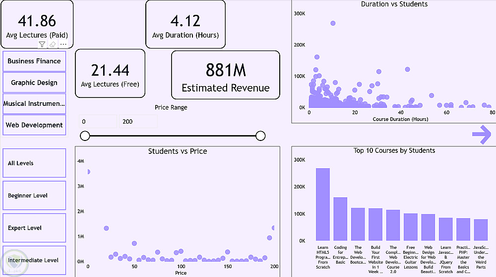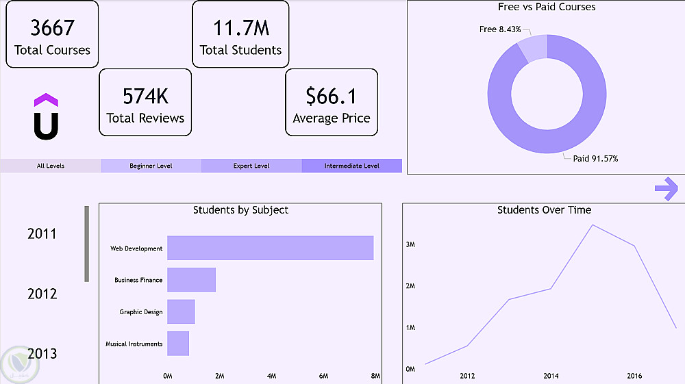 هذا المشروع يركز على تحليل بيانات دورات Udemy على مدار سنوات 2011–2017 لاستخلاص رؤى حول الأسعار، التقييمات، الموضوعات، وأداء المدربين.