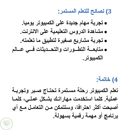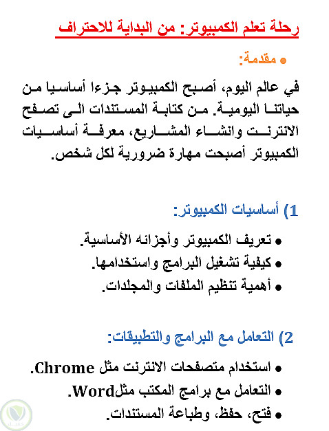 أقدّم لكم موضوع تعليمي على ملف Word منسق على صفحتين، يوضح خطوات تعلم الكمبيوتر من البداية إلى الاحتراف: