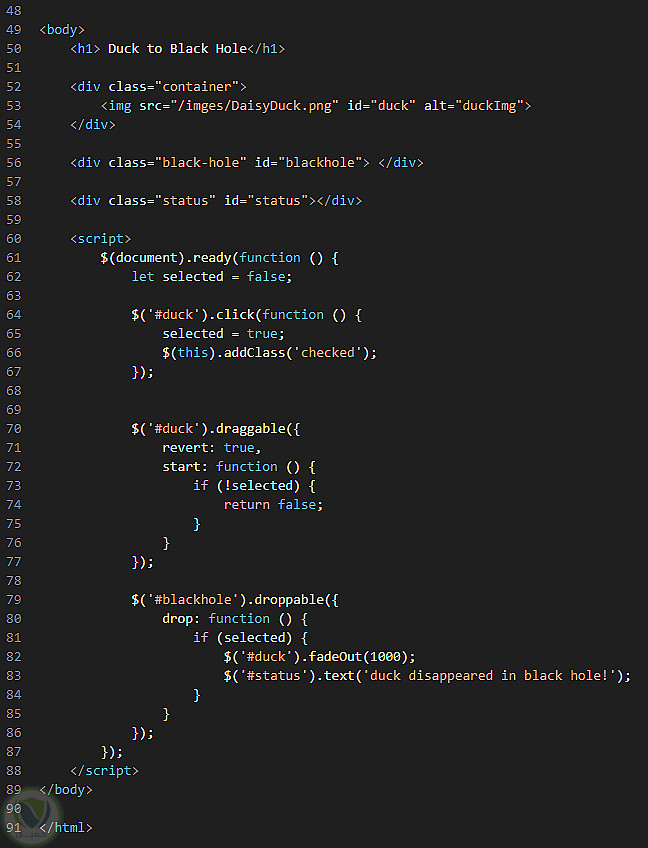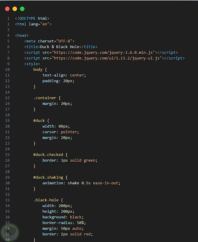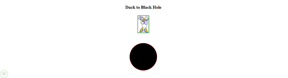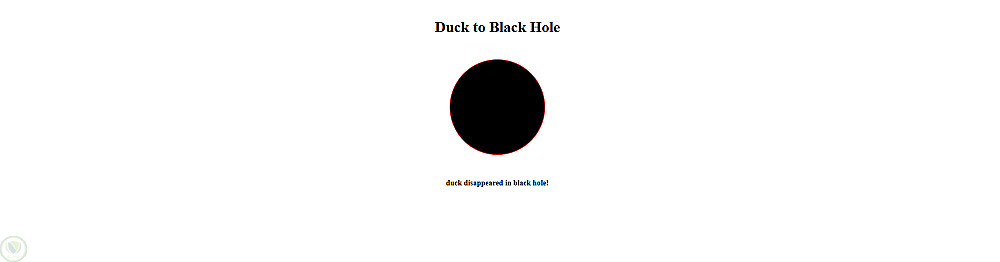 تطبيق ويب تفاعلي يستخدم خاصية السحب والإفلات (Drag & Drop) من jQuery UI. الهدف هو سحب صورة البطة إلى الثقب الأسود، مما يؤدي إلى اختفائها مع عرض رسالة تفاعلية.