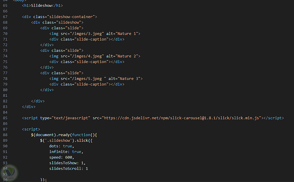 معرض صور تفاعلي باستخدام مكتبة Slick Slider مع jQuery. يمكن للمستخدم التصفح بين الصور مع مؤشرات تحكم وتجربة سلسة.