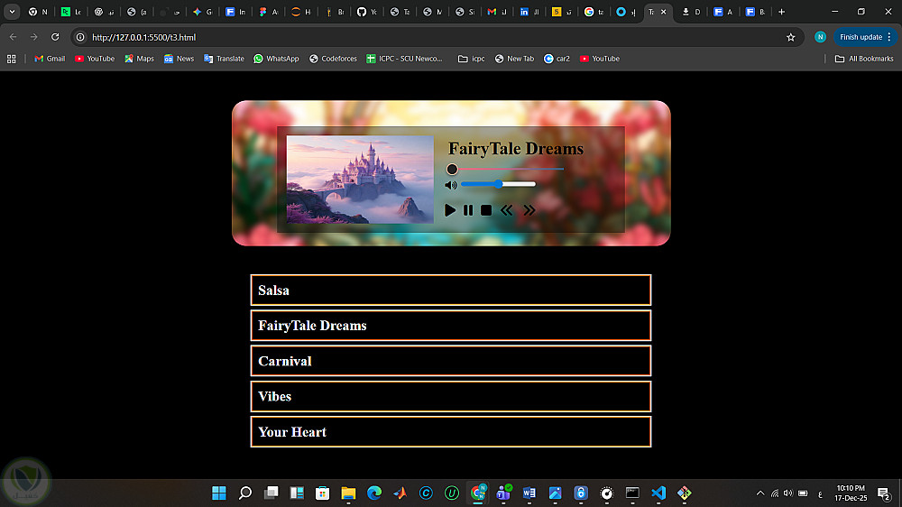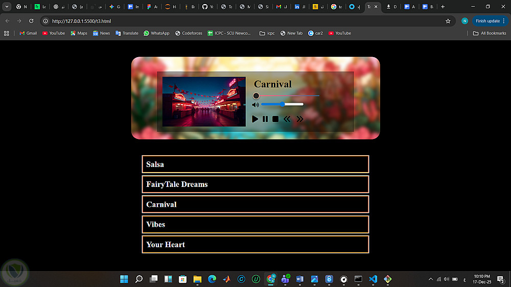 مشغل صوتيات (Audio Player) تم تطويره باستخدام HTML – CSS – JavaScript، يتيح للمستخدم التحكم الكامل في تشغيل الملفات الصوتية من خلال واجهة بسيطة وسهلة الاستخدام.