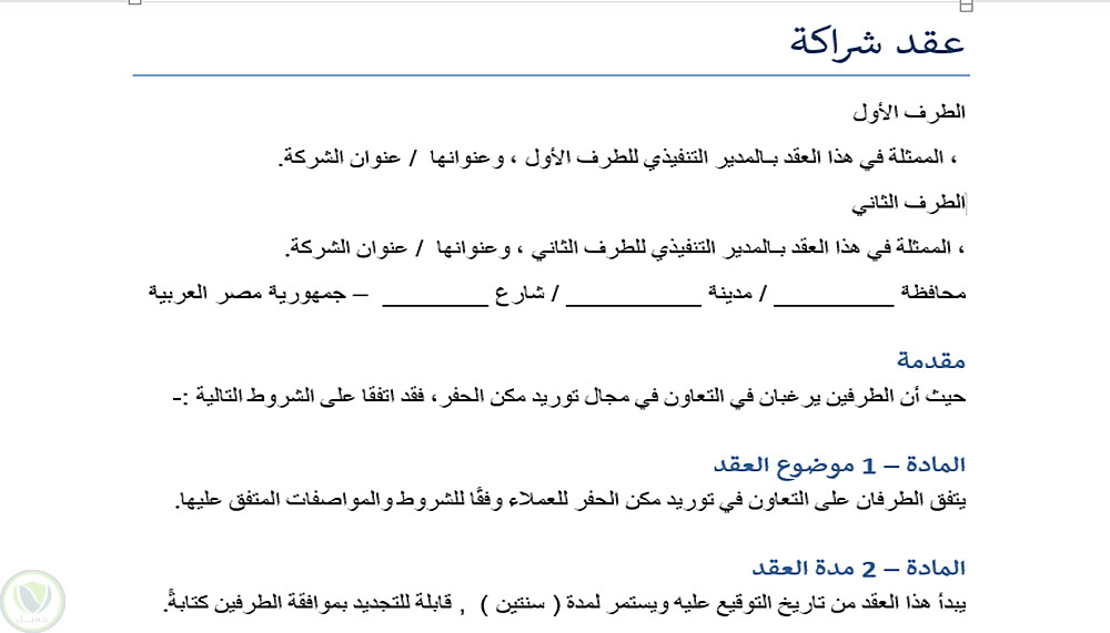 قمت بإعداد و صياغة عقد شراكة باللغة العربية بصيغة ملف Word قابل للتعديل بسهولة و إمكانية ترجمتها للإنجليزية
