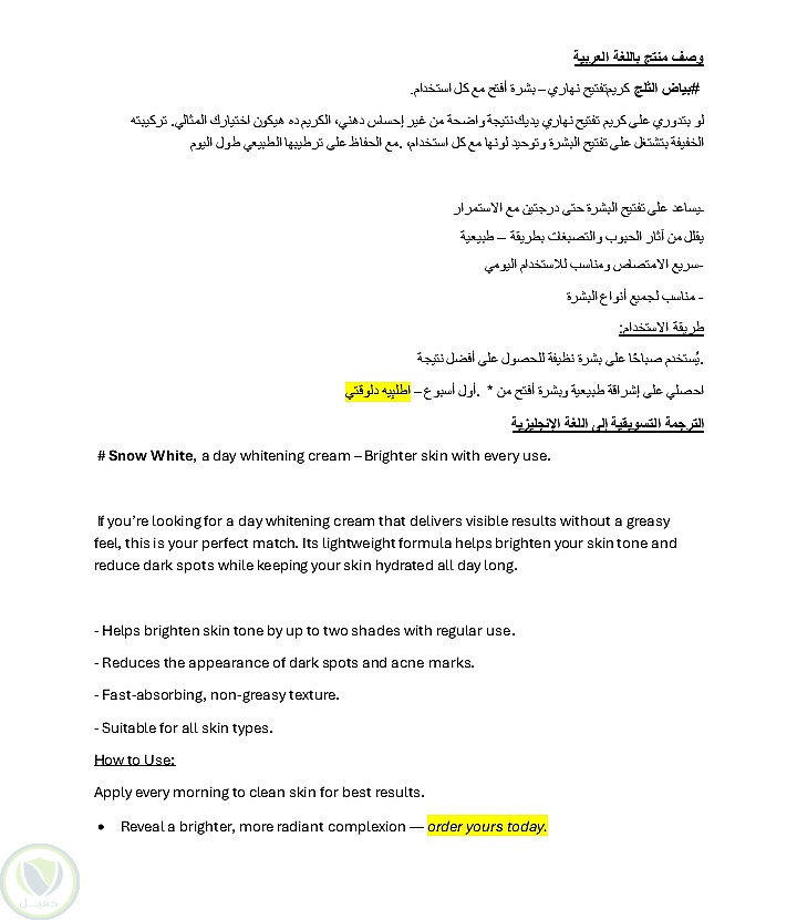 ترجمة تسويقية لوصف منتج من اللغة العربية إلى الإنجليزية