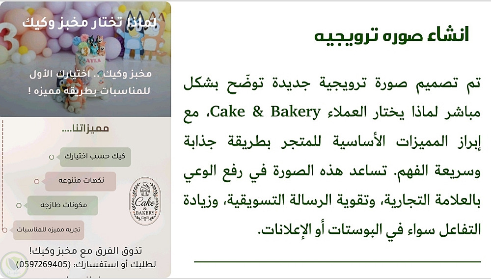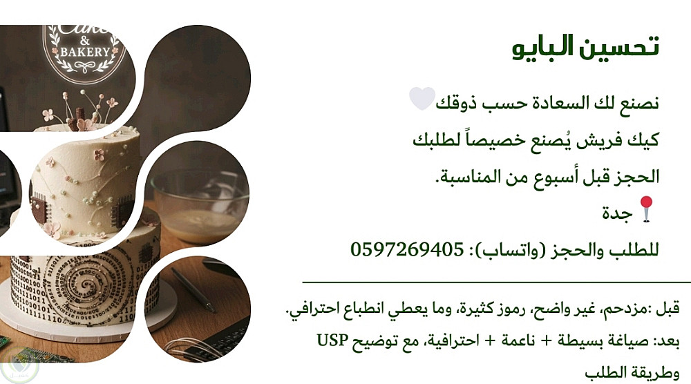 • تحسين الواجهة التعريفية (Bio): إعادة صياغة "البايو" ليكون بسيطاً وناعماً، مع إبراز نقاط القوة (USP) مثل "كيك فريش يُصنع خصيصاً" وتوضيح طريقة الطلب بشكل مباشر.