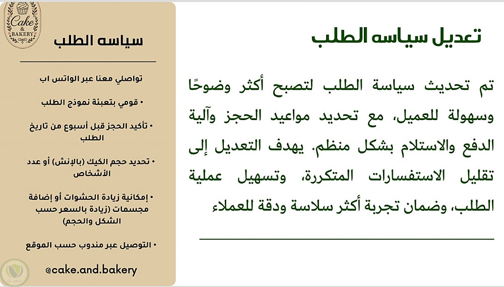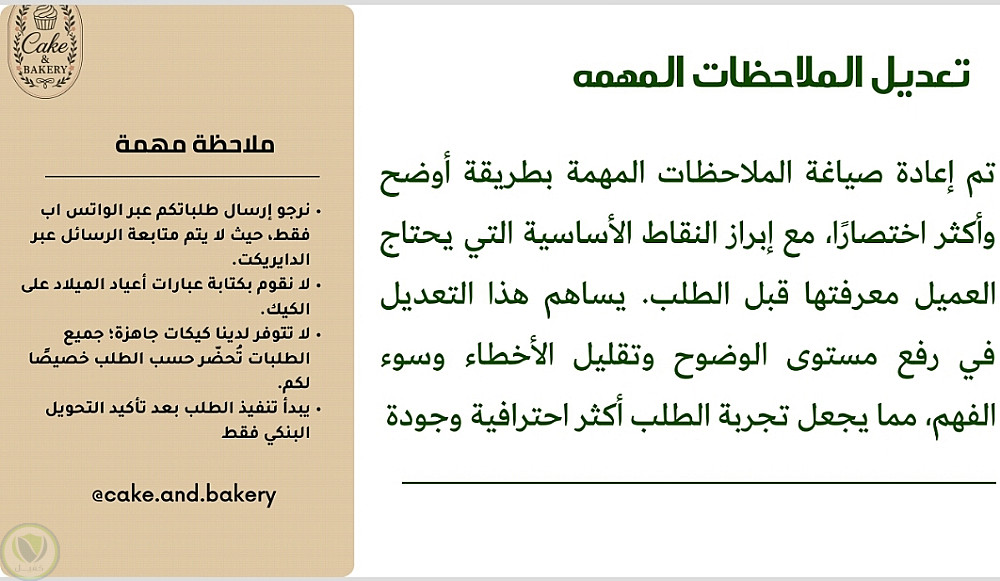 هيكلة سياسة الطلب والملاحظات: تحويل عملية الطلب إلى نموذج واضح يحدد المواعيد (الحجز قبل أسبوع)، حجم الكيك بالإنش، وآلية الدفع والاستلام، مما قلل من الاستفسارات المتكررة بنسبة كبيرة