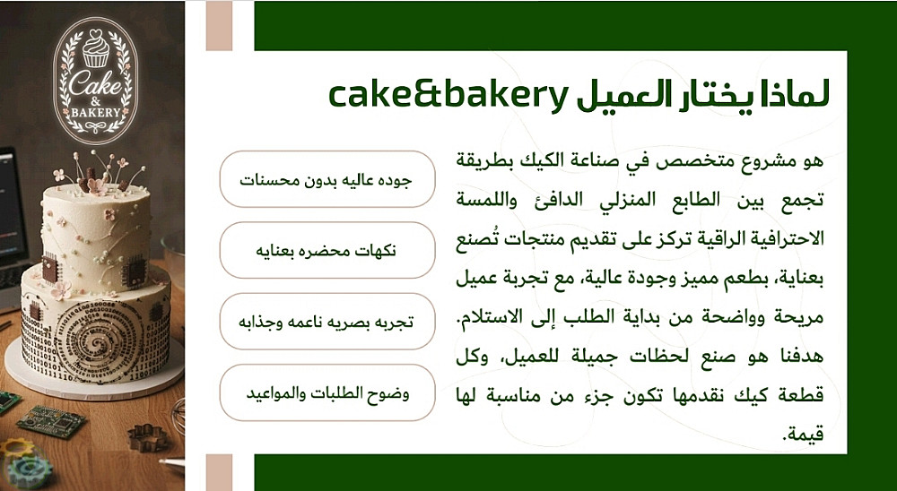 مشروع تطويري شامل يهدف إلى تحسين تجربة العميل (Customer Experience) ورفع مستوى الاحترافية لمتجر متخصص في صناعة الكيك المنزلي الفاخر. ركز العمل على إعادة صياغة الرسائل التسويقية وتنظيم آلية الطلب لزيادة المبيعات وتعزيز ثقة العملاء.