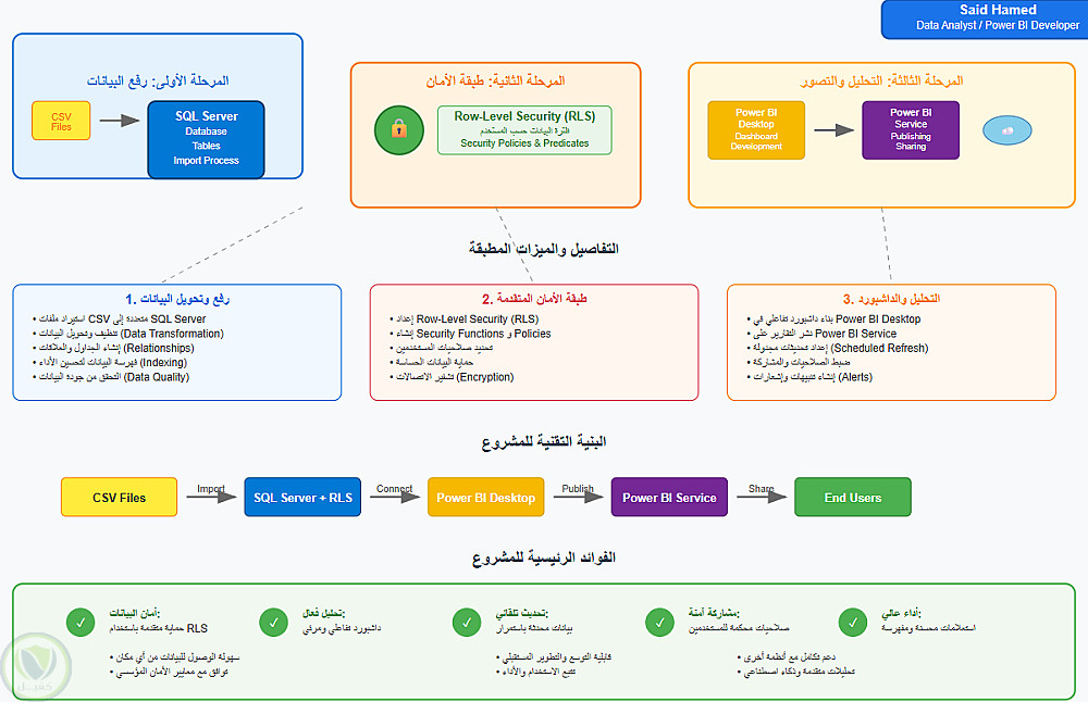 نفذت مشروعًا متكاملًا يحاكي حل ذكاء أعمال (BI) احترافي لتحليل المبيعات والربحية، باستخدام SQL Server وPower BI. يشمل المشروع دورة البيانات الكاملة من الاستيراد، والتنظيف، والنمذجة، وصولًا إلى إنشاء لوحة تحكم تفاعلية، ونشرها على Power BI Service مع تطبيق طبقات الأمان والتحكم في صلاحيات المستخدمين.