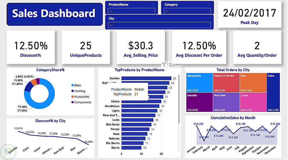 استيراد وتنظيف وتحويل البيانات باستخدام Power Query, بناء نموذج بيانات منظم (Data Model),إنشاء مقاييس محسوبة باستخدام DAX,تحليل صافي المبيعات، الخصومات، عدد الطلبات، والكميات المباعة,مقارنة الأداء حسب المدن وفئات المنتجات,تصميم مرئيات تفاعلية مع فلاتر ديناميكية.