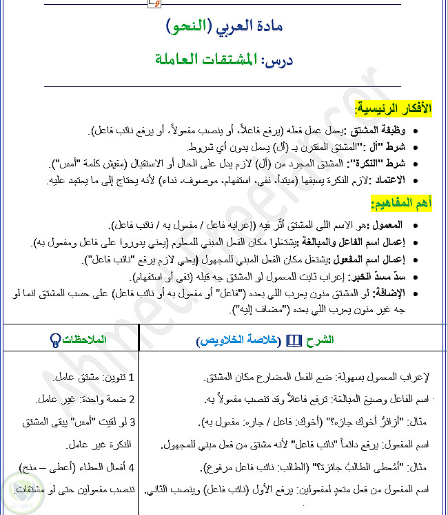 نموذج لملخص تعليمي يجمع بين دقة المحتوى وجمال التنسيق. صممت هذا العمل لتبسيط درس "أعمال المشتقات" لطلاب الثانوية العامة، مع التركيز على تريكات الإعراب وقاعدة "أفعال الشحاتة".