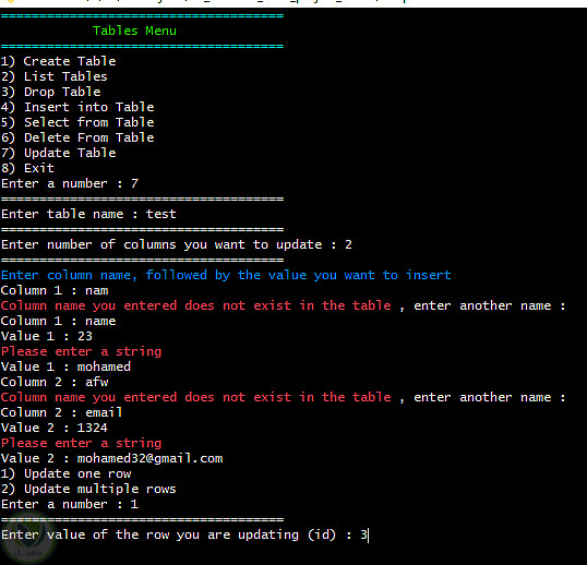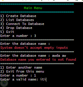 يوفّر المشروع واجهة تفاعلية قائمة على القوائم (Menu-Driven Interface) تتيح للمستخدم إنشاء قواعد البيانات، الاتصال بها، وحذفها. كما يدعم النظام الإدارة الكاملة للجداول وتنفيذ جميع عمليات CRUD وتشمل: