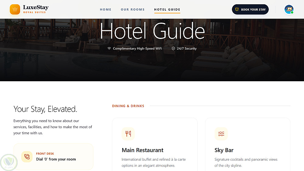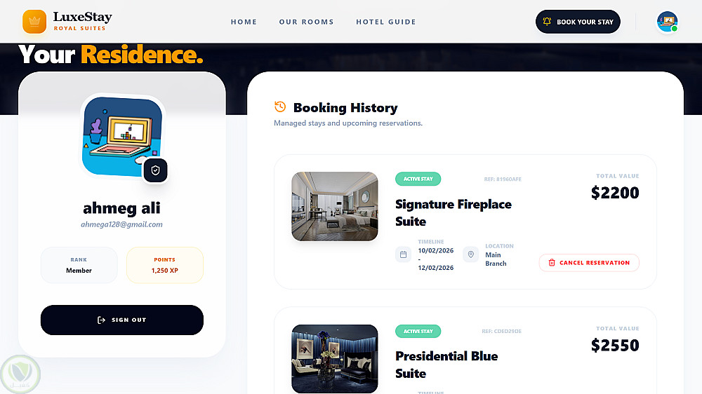 قمت بتطوير LuxeStay، وهو نظام حجز فندقي احترافي يهدف لتقديم تجربة مستخدم فاخرة وسلسة، مع حلول برمجية متكاملة تضمن كفاءة الحجز وإدارة البيانات.