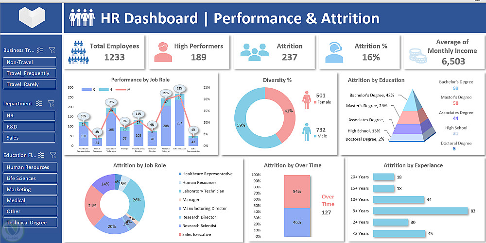Dashboard تفاعلية لتحليلات الموارد البشرية باستخدام مايكروسوفت إكسل لتحليل أداء الموظفين واتجاهات الدوران الوظيفي (Attrition).