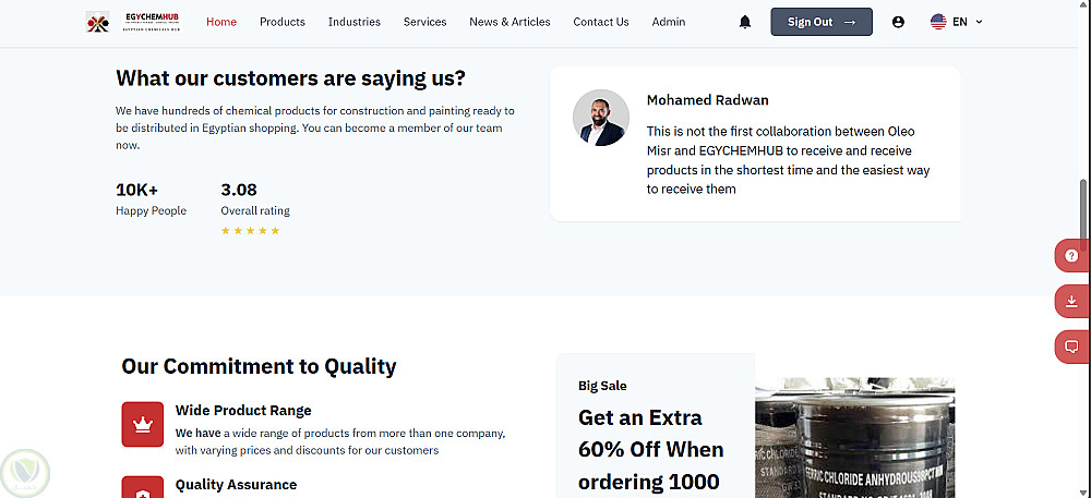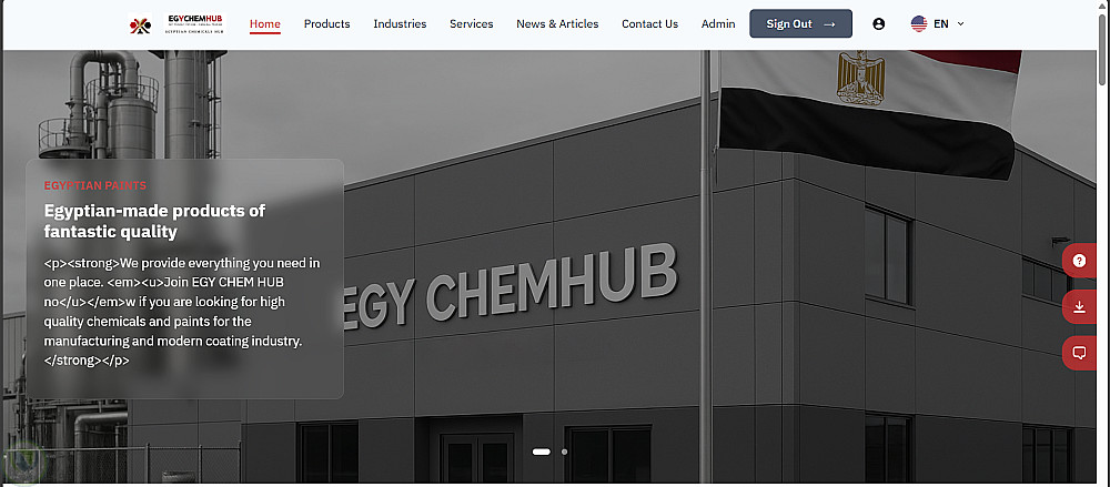 EGY CHEM HUB هو سوق إلكتروني يربط موردي المواد الكيميائية بالشركات في مصر والشرق الأوسط. يوفر أكثر من 1000 منتج كيميائي عبر مختلف الصناعات، مما يتيح للشركات تصفح المنتجات، وطلب عينات، وإجراء طلبات بالجملة مع الحصول على خصومات. كما توفر المنصة معلومات تفصيلية عن المنتجات، وشهادات السلامة، وخدمات الشحن الدولي لتسهيل عمليات شراء المواد الكيميائية للشركات الصناعية.