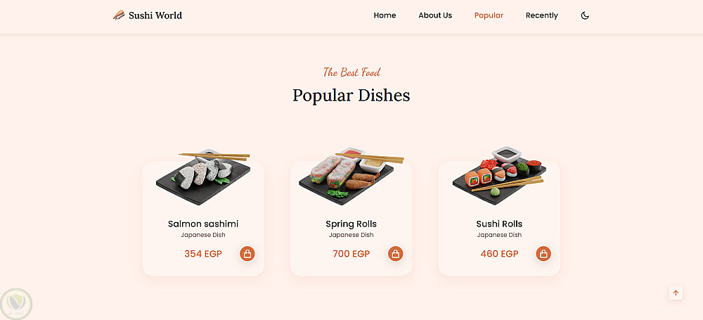Sushi World هو موقع إلكتروني لمطعم سوشي يتيح للعملاء تصفح قائمة الطعام والتعرّف على الأصناف المتاحة بسهولة.