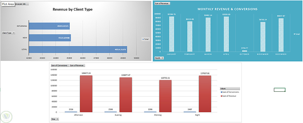 شمل العمل تنظيف البيانات، إنشاء Pivot Tables لتحليل الإيرادات حسب نوع الخدمة، وإنشاء رسوم بيانية توضح الأداء بشكل بصري واضح.