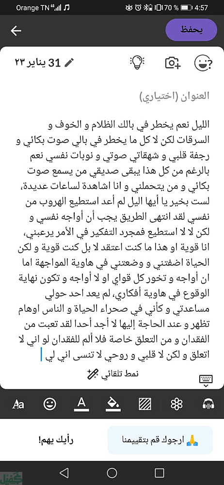 كتابة جميلة تتحدث عن الليل و حب الليل واصفة شعور، انه عمل حساس جدا