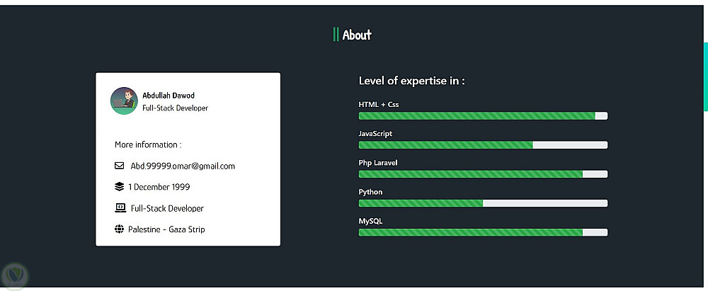 تم إنشاء وتصميم موقع شخصي احترافي لعرض الأعمال والمهارات، باستخدام HTML, CSS, JavaScript, jQuery, وBootstrap، مع التركيز على واجهة حديثة وتجربة مستخدم سلسة.