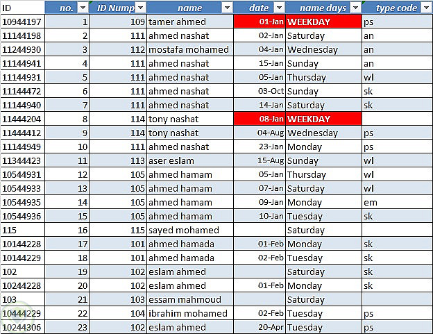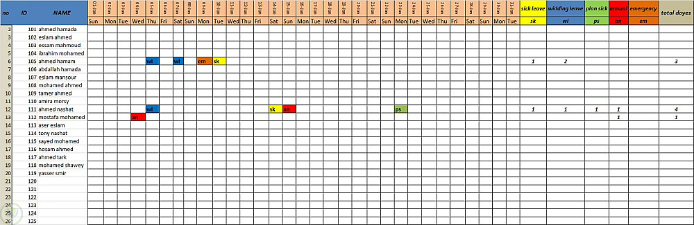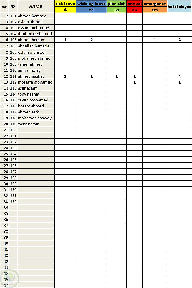 سيستم كامل لاجازات الموظفين .. اجازاة عارضة اجازة مراضية اجازة سنوية اجازة زفاف + اضافة الاجازة على مدار السنة + شيت مفصل للبحث فى داخلة خلال اشهر السنة كاملة وتعرف كمان مجموع الاجازات اللى تم اخذها من قبل موظف معين واي نوع اجازة تم استخدامها وايضا يعطي تنبيه بيوم الجمعة لاني الجمعة اجازة رسمية ويعطي تنبية والوان باليوم الجمعة