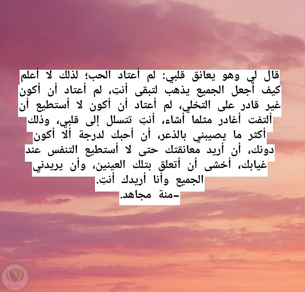 قال لي وهو يعانق قلبي: لم أعتاد الحب؛ لذلك لا أعلم كيف أجعل الجميع يذهب لتبقى أنتِ، لم أعتاد أن أكون غير قادر على التخلي، لم أعتاد أن أكون لا أستطيع أن ألتفت أغادر مثلما أشاء، أنتِ تتسلل إلى قلبي، وذلك أكثر ما يصيبني بالذعر، أن أحبك لدرجة ألا أكون دونك، أن أريد معانقتك حتى لا أستطيع التنفس عند غيابك، أخشى أن أتعلق بتلك العينين، وأن يريدني الجميع وأنا أريدك أنتِ.