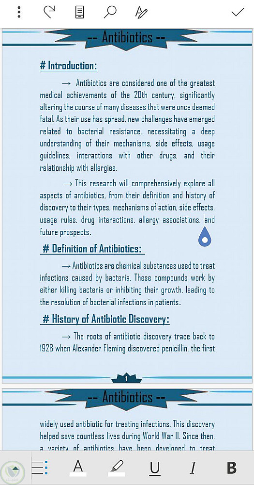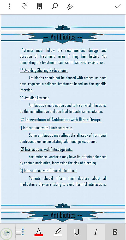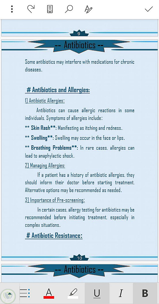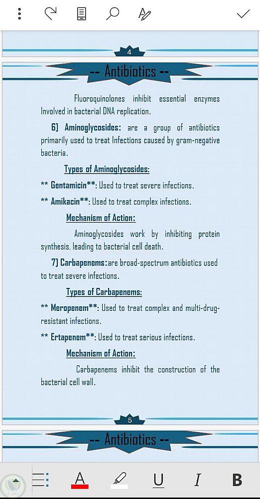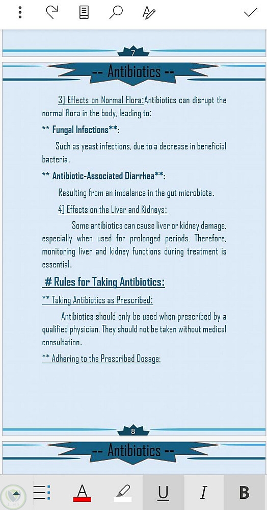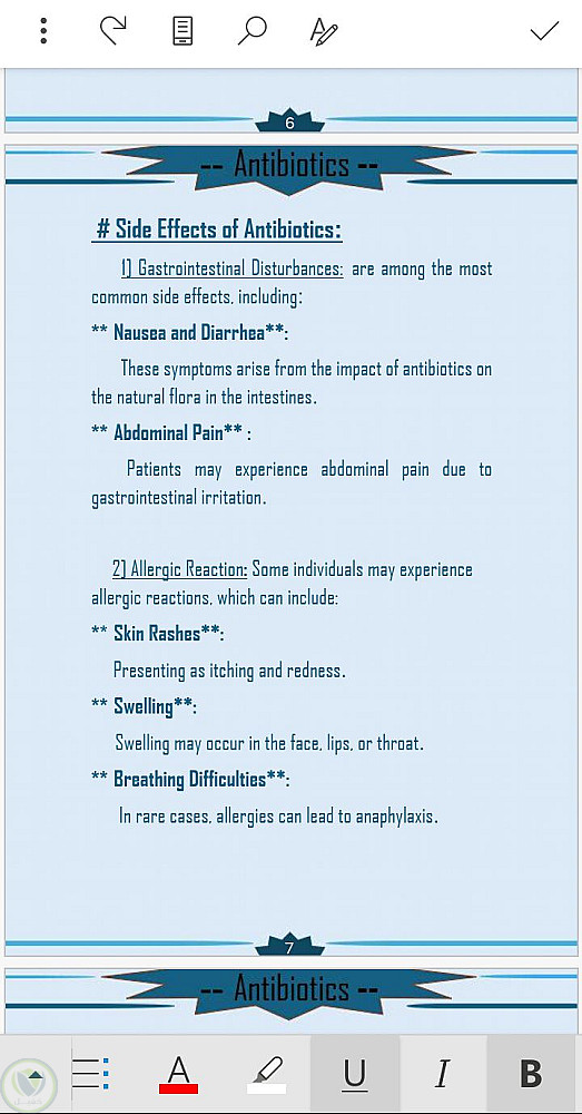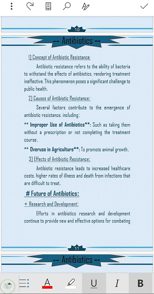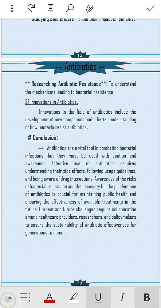 قمت في هذا البحث الذي هو عبارة عن تكليف جامعي خاص بي وبدأت بجمع المعلومات عن الموضوع الا وهو المضادات الحيوية ومن ثم أخذت النص من المراجع العلمية وقمت بكتابتها على برنامج الورد وتنسيقها وأضافة القالب لكي يضيف جمال للبحث