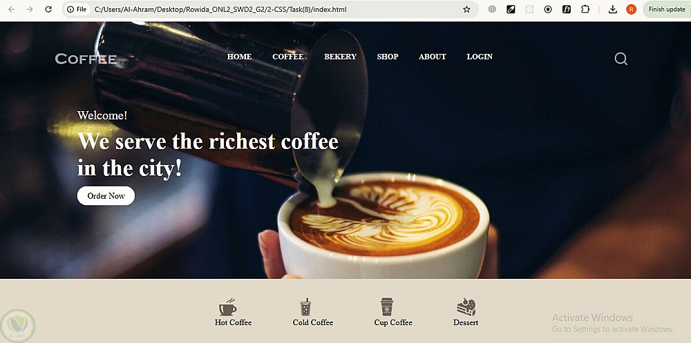 موقع ويب حديث لمقهى يعكس الأجواء الدافئة والمميزة لتجربة القهوة. يتميز الموقع بتصميم متجاوب يدعم الوضع الفاتح والداكن، مع واجهة أنيقة وسهلة الاستخدام. يحتوي على قائمة المشروبات والأطعمة، معرض للصور، نموذج حجز، وخريطة توضح موقع المقهى. تم بناء الموقع باستخدام HTML, CSS, Bootstrap, JavaScript، مع تحسينات في UI/UX لضمان تجربة مستخدم سلسة وجذابة.