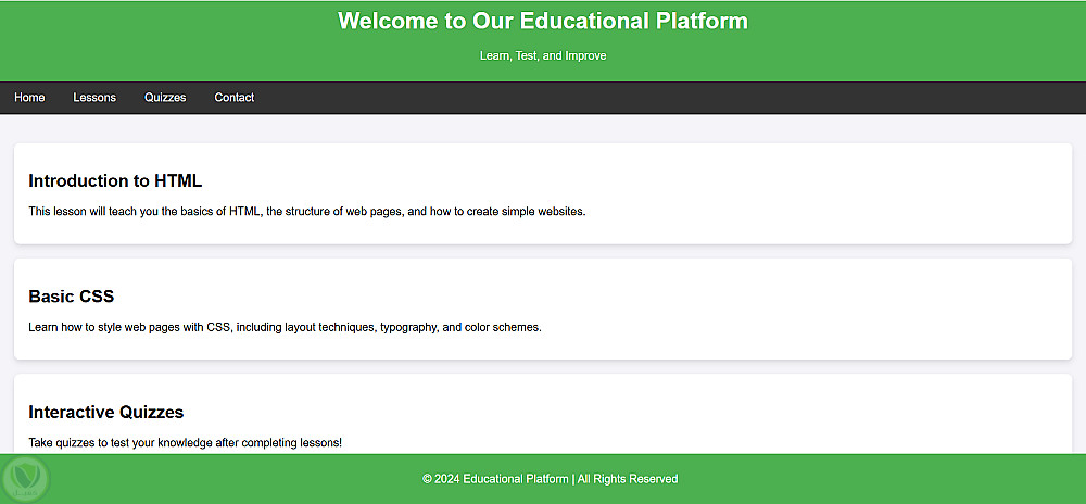 قمت بإنشاء هذا الموقع التعليمي باستخدام HTML و CSS فقط. الموقع يتيح للمستخدمين تعلم مواضيع مختلفة بشكل تفاعلي، مع إضافة اختبارات صغيرة في نهاية كل درس لقياس مدى فهمهم. التصميم بسيط وألوانه مريحة للعين، مما يساعد على جعل تجربة التعلم أكثر متعة وسهولة.