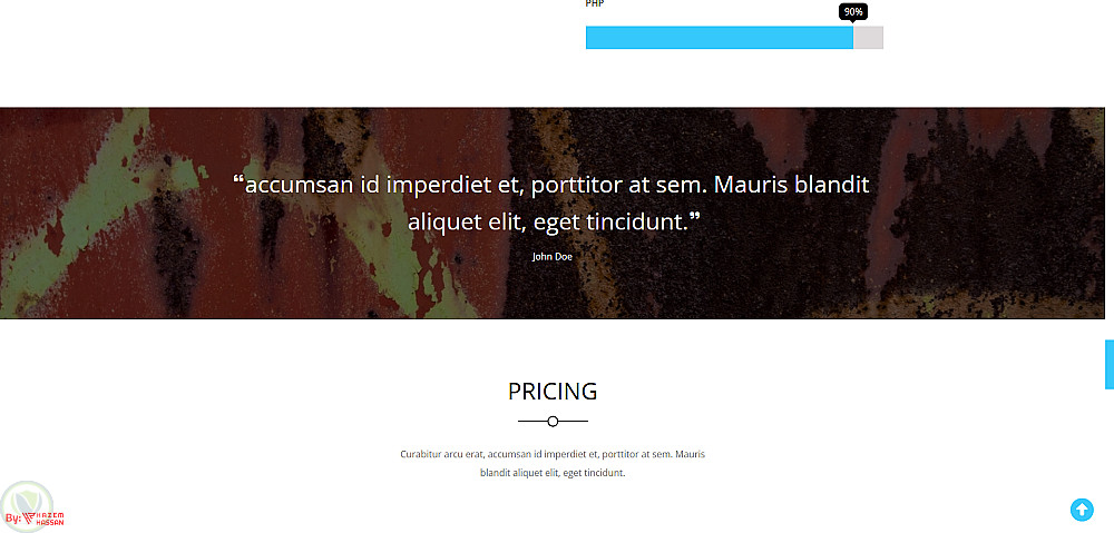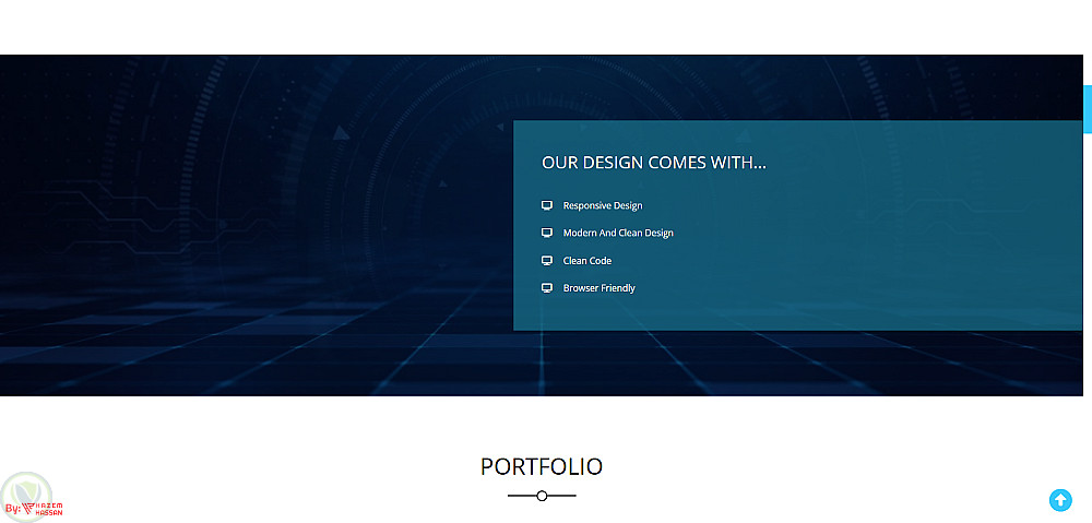 - تحتوي الصفحة على 7 أقسام: (الهبوط، الخدمات، المشاريع، حول، الشهادات والمهارات، التسعير، والتواصل).