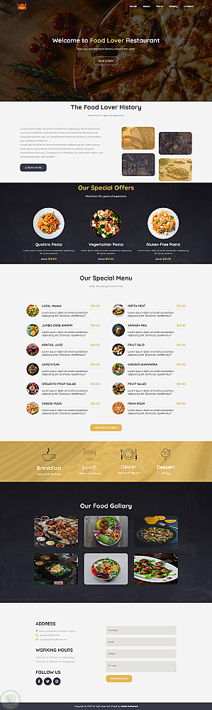 موقع يعرض فية وصفات الاكل والمنيو الخاص بالاكل وايضا عروض علي الوجبات ويحمل الويبسايت عنوان المطعم ورقم للتواصل وعمل اوردر ويحتوي ايضا علي فورم لتسجيل أراء العملاء وللتواصل فيسبوك او واتساب او عبر الهاتف المحمول .
