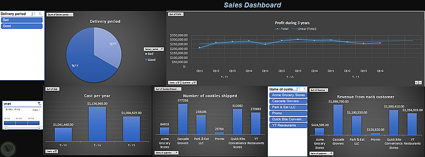 تم تطوير لوحة تحكم تفاعلية لمراقبة وتحليل أداء المبيعات، مما يساعد الشركات على تحسين استراتيجيات الإيرادات، تتبع الفترات الزمنية المختلفة، وتحليل تأثير جودة التسليم على الأرباح.