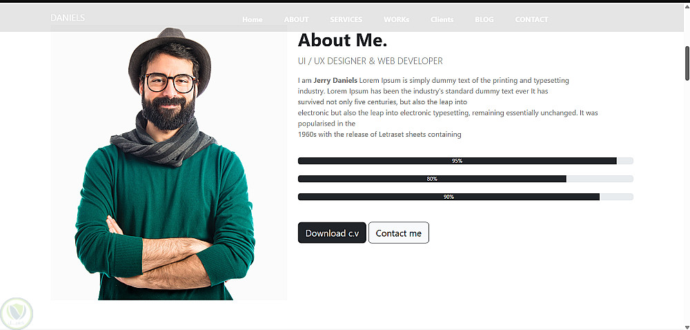 موقع شخصي متجاوب يعرض السيرة الذاتية والخبرات بطريقة احترافية، باستخدام HTML, CSS, Bootstrap، مع تصميم أنيق وسهل التصفح، مما يوفر تجربة مستخدم سلسة وواجهة جذابة.