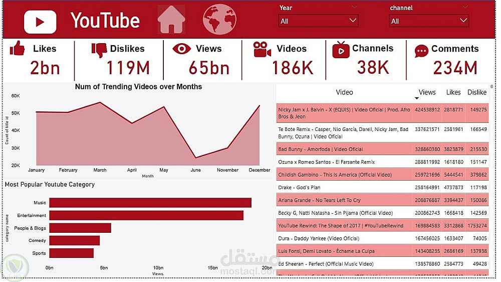 تحليل بيانات فيديوهات وقنوات YouTube الرائجة باستخدام Power BI