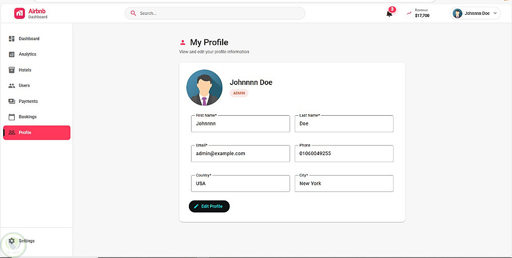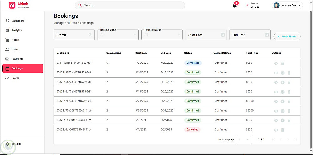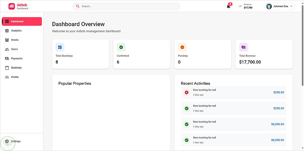 لوحة تحكم Airbnb هي منصة إدارية شاملة مصممة لإدارة العمليات الأساسية للمنصة بكفاءة ومرونة. توفر واجهة مركزية تتيح للمضيفين، ومديري العقارات، والمسؤولين متابعة وإدارة الحجوزات، نشاط المستخدمين، المدفوعات، والتحليلات بسهولة.