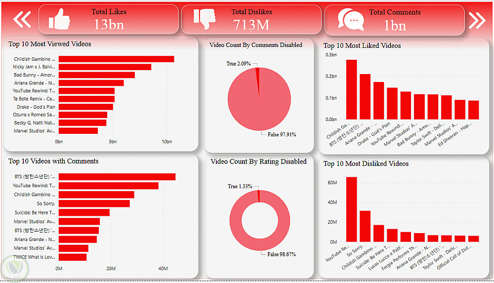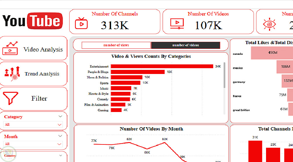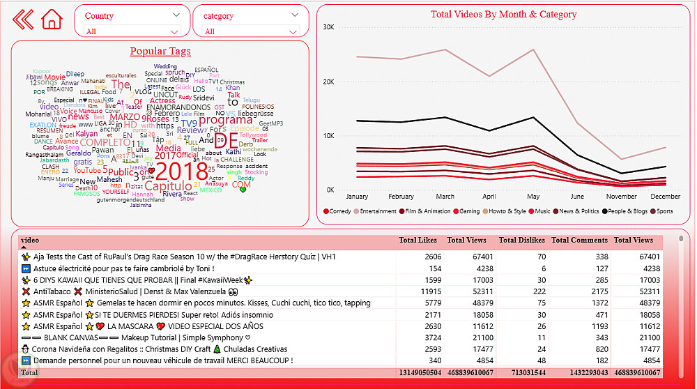 بدأت هذا المشروع بتنزيل ملفات Excel تحتوي على بيانات الفيديوهات الأكثر شهرة في عدة دول، ثم قمت بدمجها باستخدام خاصية Append. بعد ذلك، أجريت تحويلات على البيانات، وعالجت الأخطاء، وأضفت أعمدة مخصصة مثل عمود مفتاح التاريخ. قسمت البيانات إلى جداول منفصلة تشمل الفئات، التواريخ، الفيديوهات، القنوات، والدول، بالإضافة إلى جدول الحقائق. بعد تجهيز الجداول، حمّلتها إلى Power BI ونفذت نمذجة دقيقة باستخدام مخطط النجمة، مما سهّل الربط بين الجداول. استخدمت DAX لإنشاء مقاييس لحساب مؤشرات الأداء مثل عدد الفيديوهات والمشاهدات. صممت لوحة تحكم تفاعلية توضح أكثر أنواع الفيديوهات تصدرًا للترند، وتحلل العلاقة بين عدد الفيديوهات والزمن، إلى جانب عرض الفيديوهات الأعلى والأقل مشاهدة. تساهم اللوحة في اكتشاف الأنماط وفهم التوجهات، ما يساعد في اتخاذ قرارات استراتيجية مبنية على البيانات.