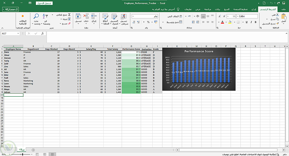 مشروع Excel متكامل لتتبع أداء الموظفين، يشمل حساب عدد أيام العمل والغياب، تقييم الأداء، احتساب الرواتب باستخدام دوال IF، SUM، التنسيق الشرطي، وإظهار النتائج النهائية بطريقة واضحة ومنظمة.