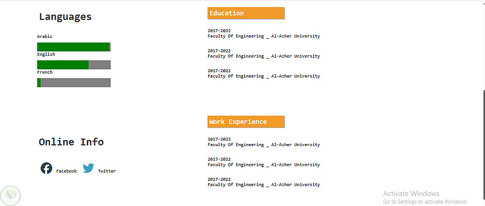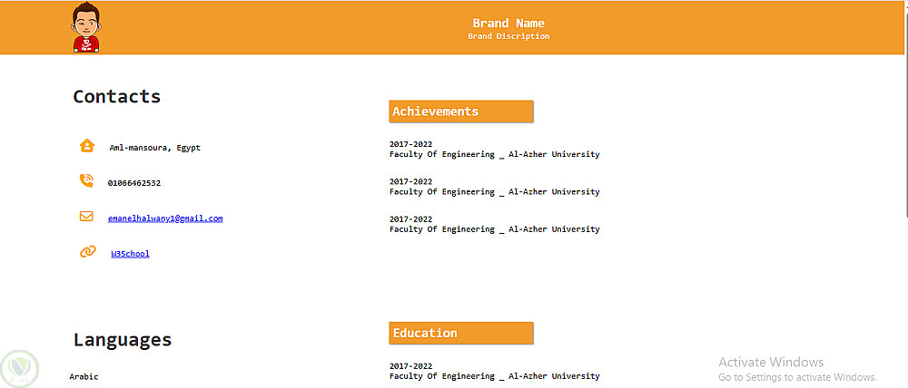 موقع إلكتروني لعرض تفاصيل عن الشخص تتضمن طرق التواصل معه ، مراحله التعليميه ، انجازاته ، خبراته المهنية و اللغات التي يتحدث بها .