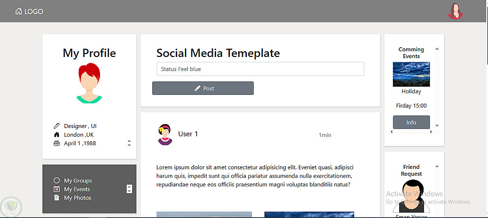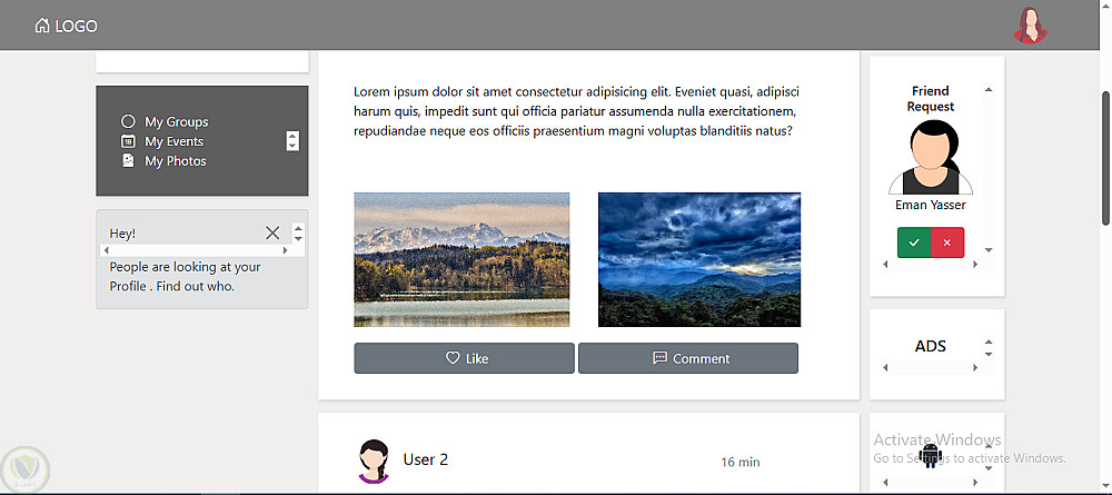 موقع إلكتروني مقسم إلي navbar و المحتوي مقسم إلي 3 أقسام ، قسم يعرض profile of user وبعض التفاصيل عنه ، وقسم أخر يعرض comming events for user And Friend Requests ، و أخر قسم يتم فيه عرض posts of friends .