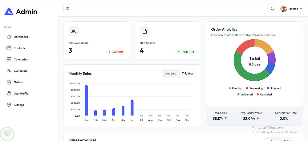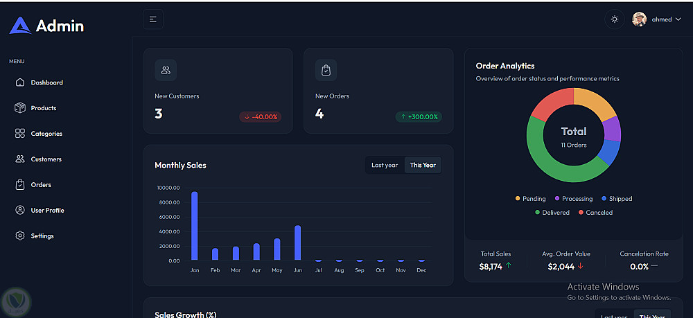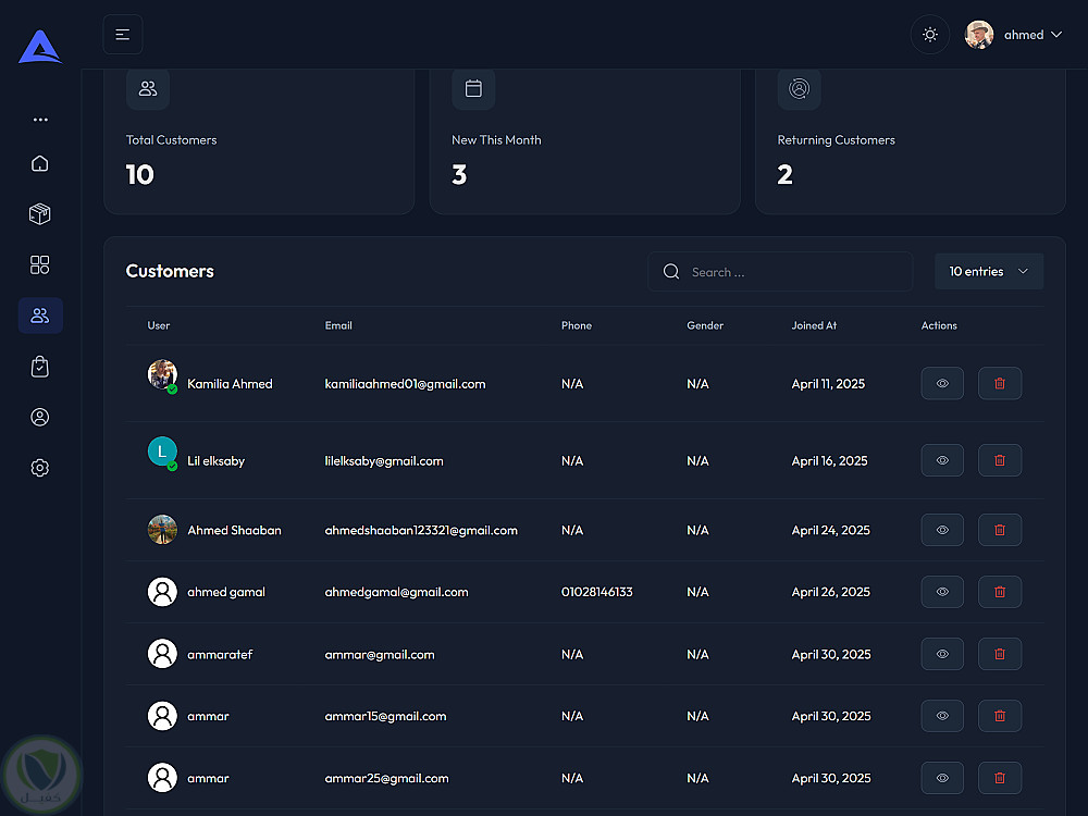 تتضمن اللوحة أقسامًا متعددة مثل: إدارة المستخدمين (عرض – تعديل – حذف)، إدارة المنتجات أو الطلبات، وصلاحيات متعددة (مشرف – موظف – زائر).