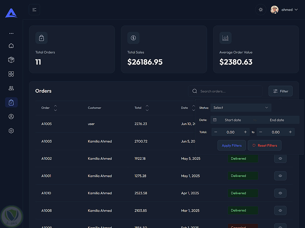تم دمجها مع API ديناميكي يدعم البحث، الفرز، والتحميل، إضافة إلى إحصائيات وتقارير مرئية باستخدام ApexCharts.